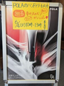 Posted on 2024年5月10日2024年5月9日 by POLA無料ハンドトリートメント体験(6月開催分)のお知らせPOLAさんより、ハンドトリートメントの無料出張イベントが開催されます。約10分で癒やしの体験ができます♪開催日6月4日(火) 10:00~13:00