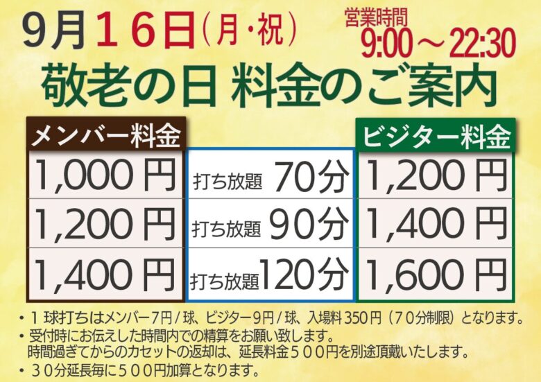 Posted on 2024年9月2日2024年9月2日 by 9/16(月祝) 敬老の日の料金について9/16(月祝)敬老の日は、次の料金にて次の料金にて朝9時より夜22時半まで営業致します。※朝9時からの営業時間となります。土日と営業開始時間が異なりますのでご注意下さい。皆様のご来場をお待ちしております。