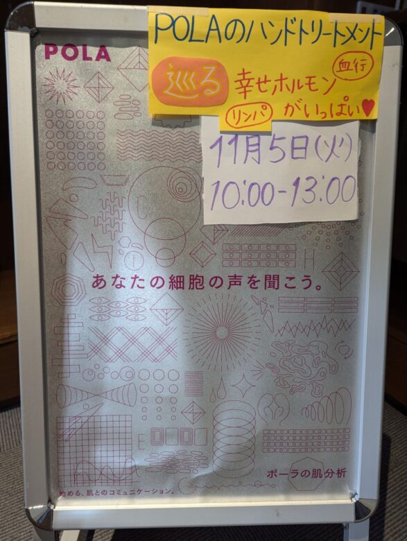 Posted on 2024年10月15日2024年10月15日 by POLA無料ハンドトリートメント体験(11月開催分)のお知らせPOLAさんより、ハンドトリートメントの無料出張イベントが開催されます。約10分で癒やしの体験ができます♪ 開催日11月5日(火) 10:00~13:00