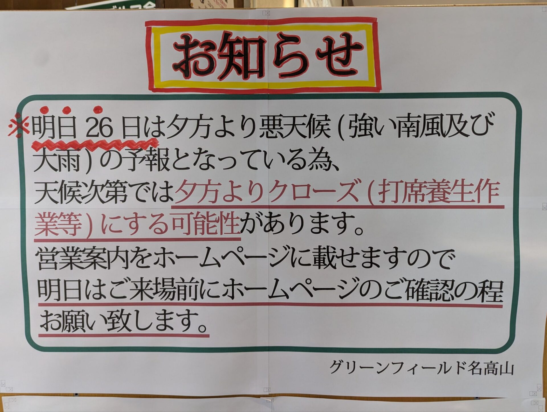 Posted on 2024年11月25日2024年11月26日 by 【11/26】明日の営業についてのお知らせ明日26日は夕方より悪天候(強い南風及び大雨)の予報となっている為、天候次第では夕方よりクローズ(打席養生作業等)にする可能性があります。営業案内をホームページに載せますので明日はご来場前にホームページのご確認の程お願い致します。