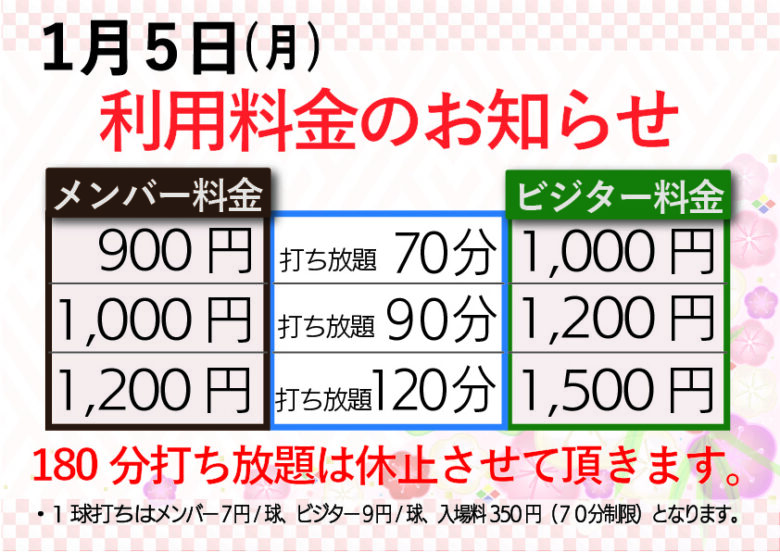Posted on 2026年1月2日2026年1月5日 by 1月5日利用料金のお知らせ1月5日(月)は、180分打ち放題を休止させて頂きます。(また、1球打ちは70分制限とさせて頂きます)ご了承の程、お願い致します。